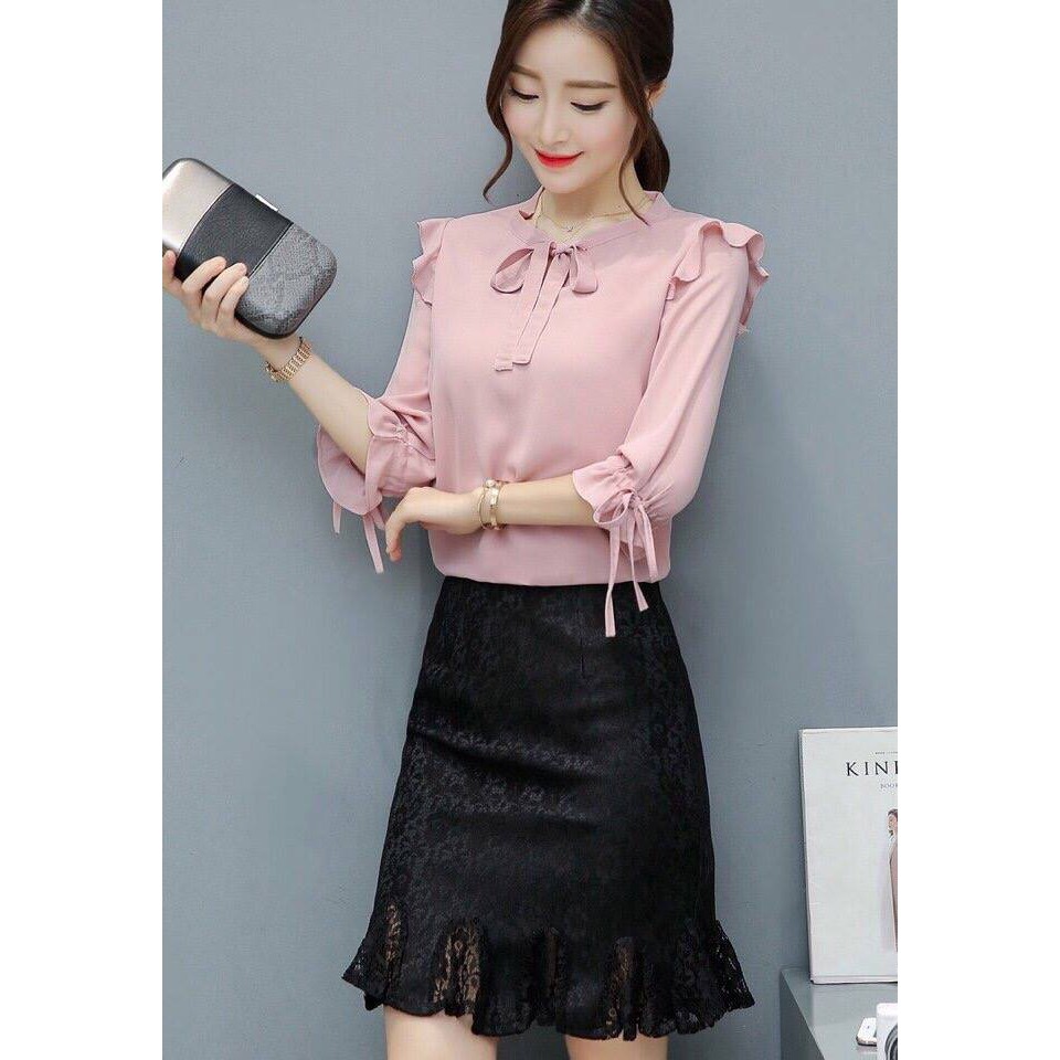Ao Sơ Mi Nữ Cổ Ren Thắt Nơ Thanh Lịch Sm143 Hang Quảng Chau Cao Cấp