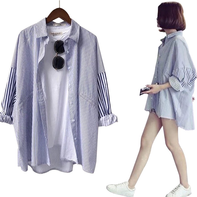 Giảm 24 Ao Sơmi Sọc Tay Dai Form Rộng Cho Nữ Sanh điệu