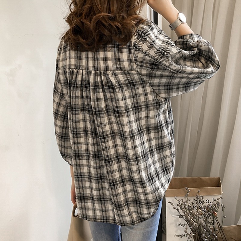 Ao Sơ Mi Nữ Sọc Caro Xanh đen Form Rộng Tay Lỡ Dễ Thương Bt2779