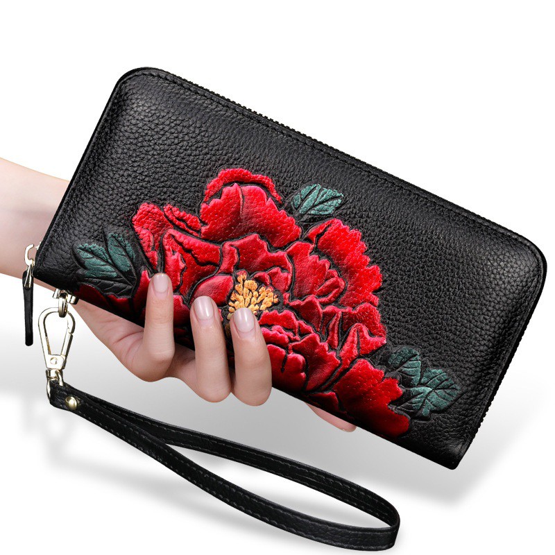 Vi Cầm Tay Nữ Dai Da Thật Cao Cấp Full Box Họa Tiết Hoa Mẫu đơn Lớp Da Bo đầu Tien Mềm đẹp Co Khoa Keo đựng điện Thoại Shopee Việt